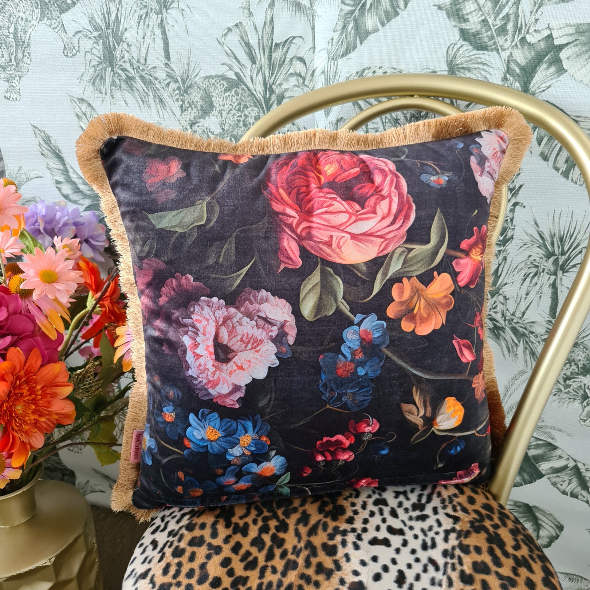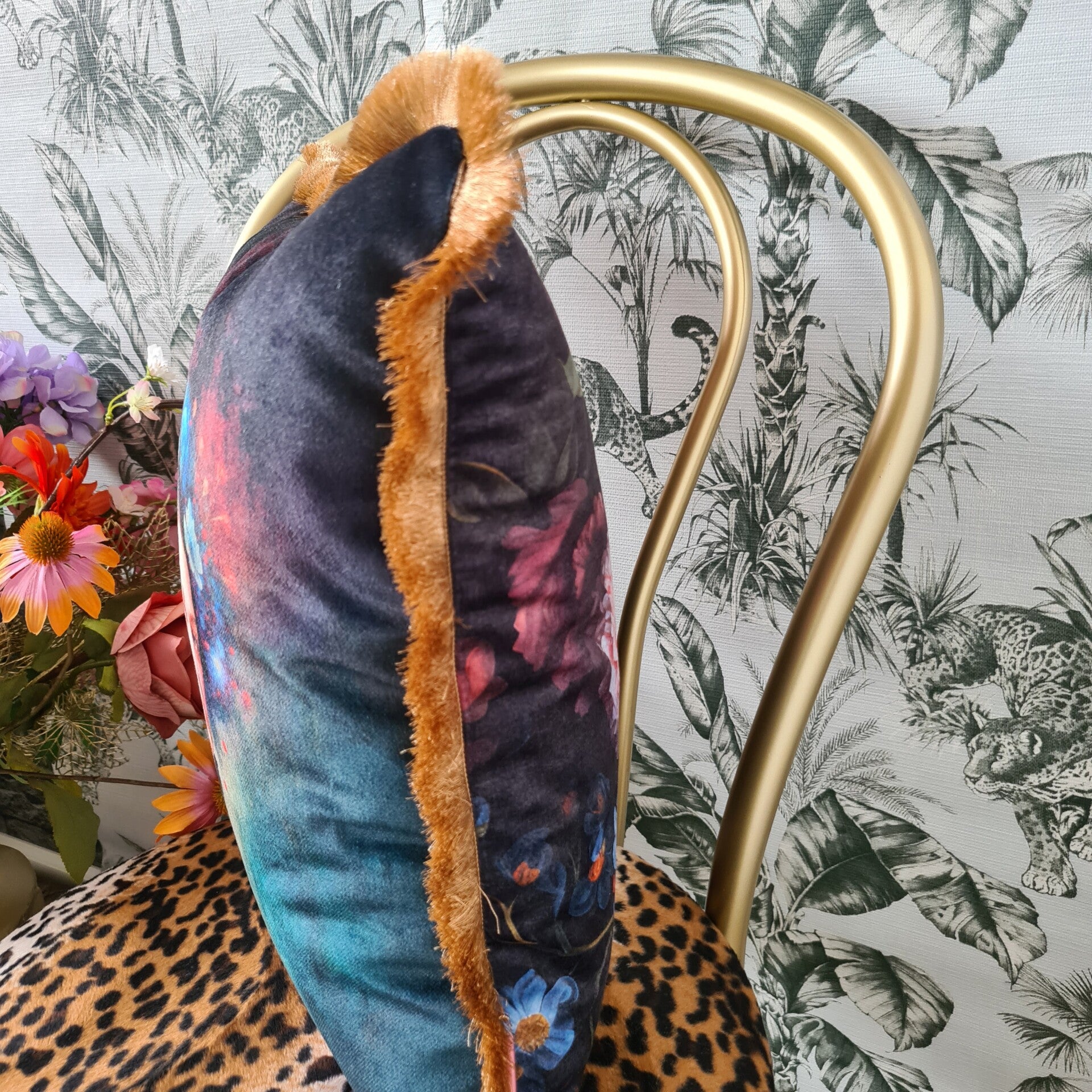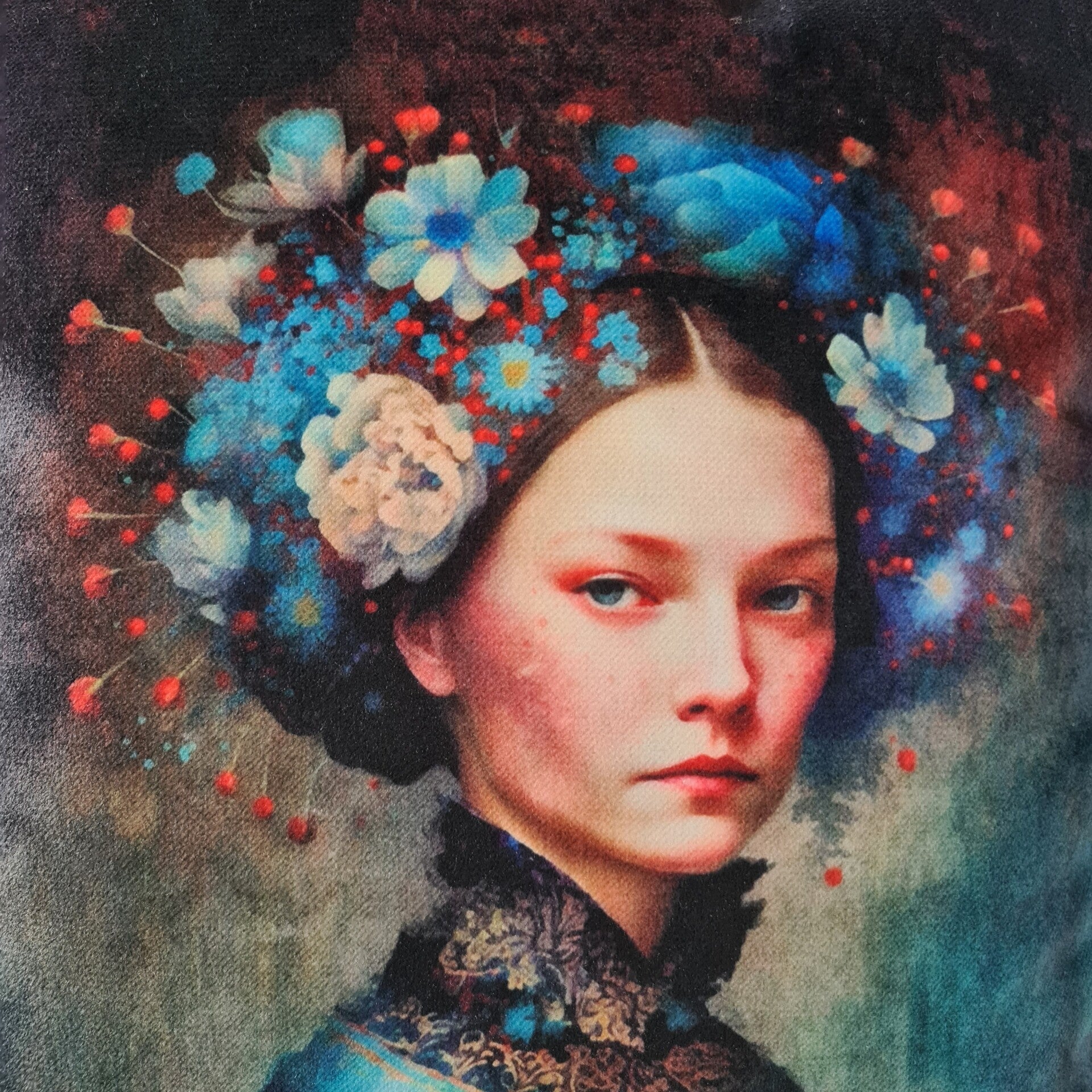 Creëer een prachtige vintage look in je interieur met deze unieke blauw velours kussenhoes van 45x45 cm. De voorzijde van de kussenhoes toont een print van een vrouwengezicht met bloemen in schitterende kleuren, wat het kussen een artistieke en kleurrijke uitstraling geeft. De achterzijde is voorzien van een levendige bloemenprint, die een prachtig contrast biedt. De kussenhoes is verfraaid met een goudkleurige franjeband, die een vleugje glamour toevoegt.