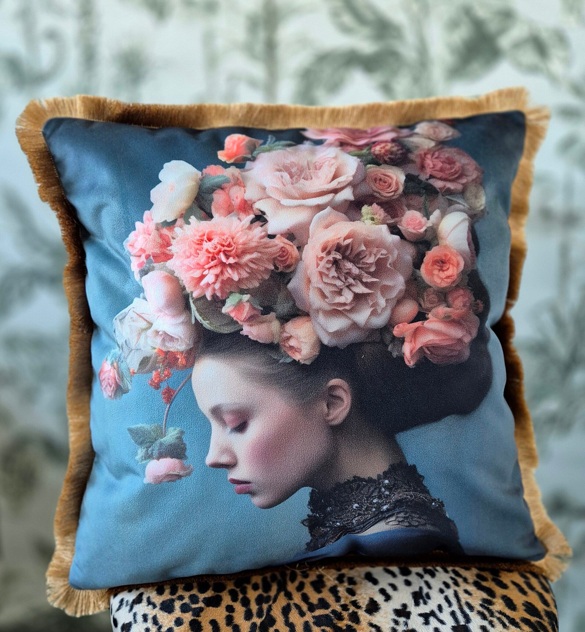 Betreed de betoverende wereld van verfijnde esthetiek met deze prachtige handgemaakte velours kussenhoes. De diepe staalblauwe kleur fungeert als het perfecte canvas voor een subtiel en toch opvallend vrouwengezicht, omlijst door weelderige bloemen in zachte pasteltinten. Deze artistieke voorzijde van de kussenhoes vangt de essentie van een weelderige bloementuin op een zomerse ochtend, met een mix van romantiek en subtiele elegantie die een vleugje poëzie toevoegt aan elk interieur.