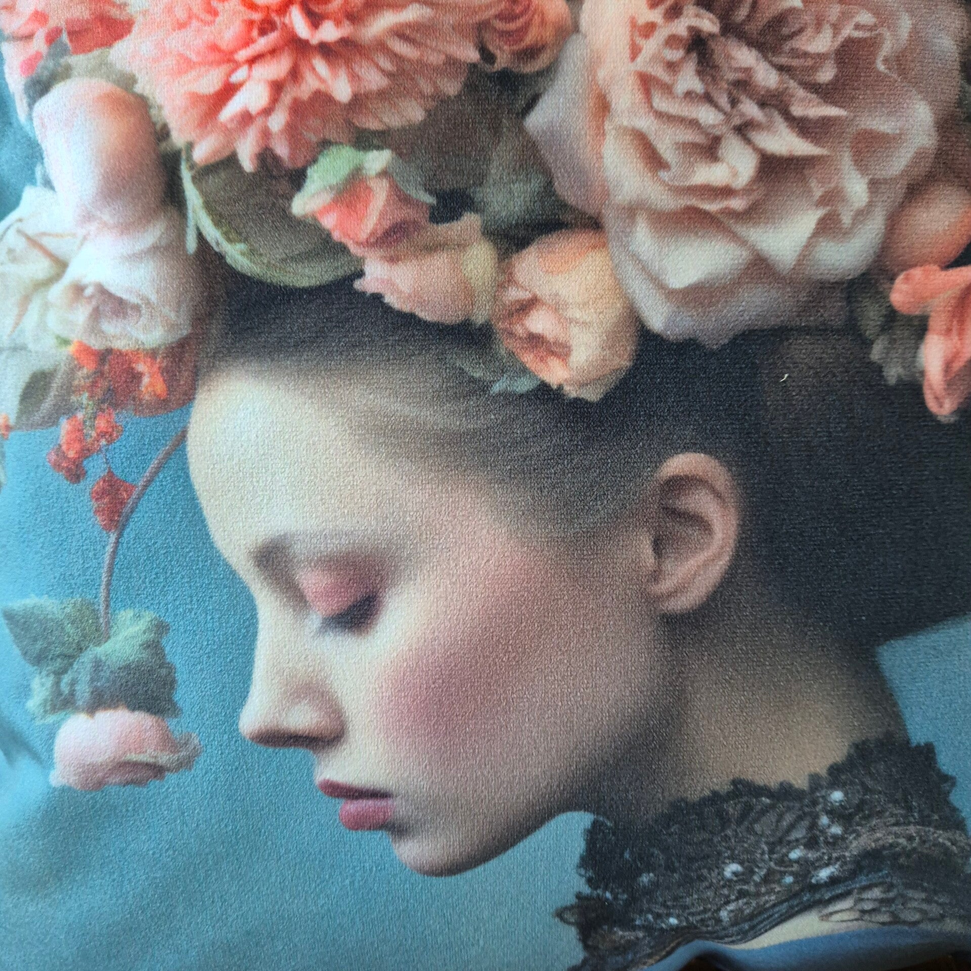 Staalblauwe velours kussenhoes met vrouwengezicht, sierkussenhoes 45x45cm, velvet kussenhoes met bloemenprint