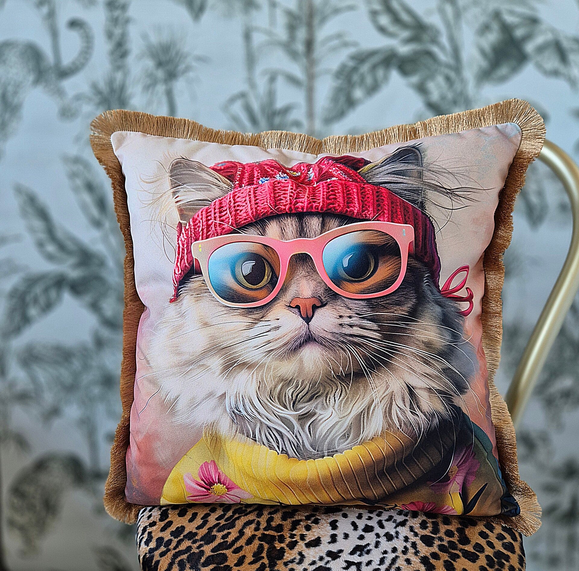 Transformeer je interieur met een vleugje speelse stijl met deze handgemaakte velours kussenhoes van 45x45cm. Deze unieke hoes ontworpen om een glimlach op je gezicht te toveren en een vleugje flair toe te voegen aan elke ruimte waar je de kussenhoes plaatst. Aan de voorzijde pronkt een grappige print van een harige schattige poes met een ondeugende rode muts en een trendy roze zonnebril, waardoor deze kussenhoes een echte blikvanger is.