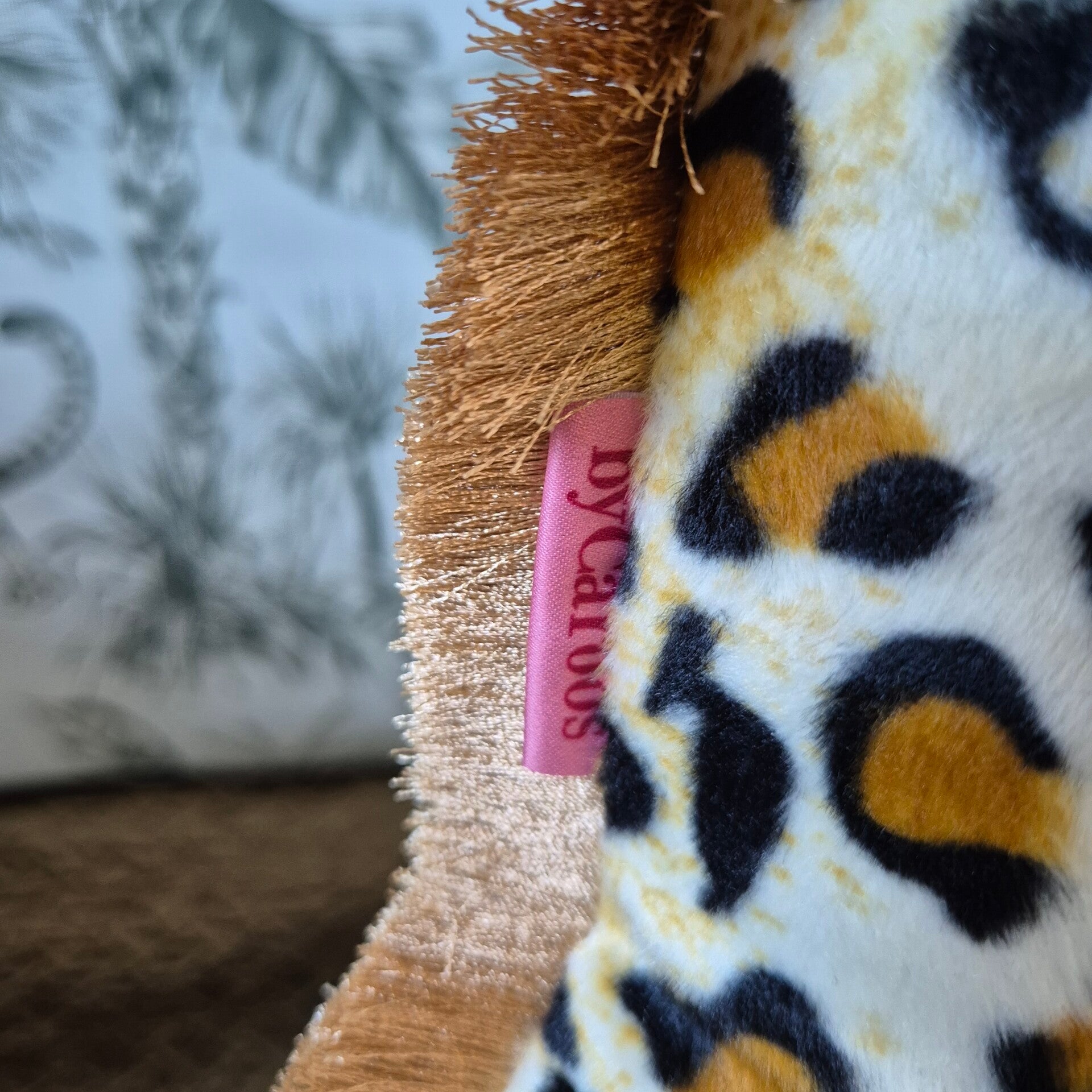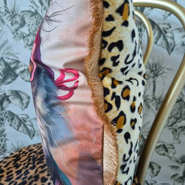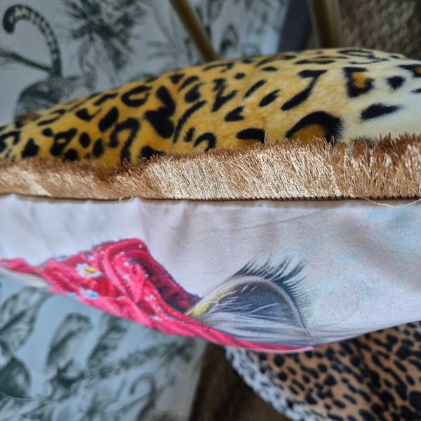Aan de achterzijde van de kussenhoes bevindt zich een weelderige harige stof met een trendy panterprint, die zorgt voor een boeiende textuur contrast met de velours voorzijde. Deze speelse combinatie van materialen voegt een extra dosis krakter toe aan de hoes en maakt het een veelzijdig accessoire dat moeiteloos past bij verschillende interieurstijlen.