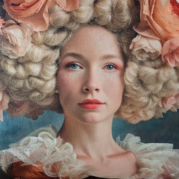 De voorkant is versierd met een betoverende print van een vrouw met blond haar, omgeven door levendige, kleurrijke bloemen.