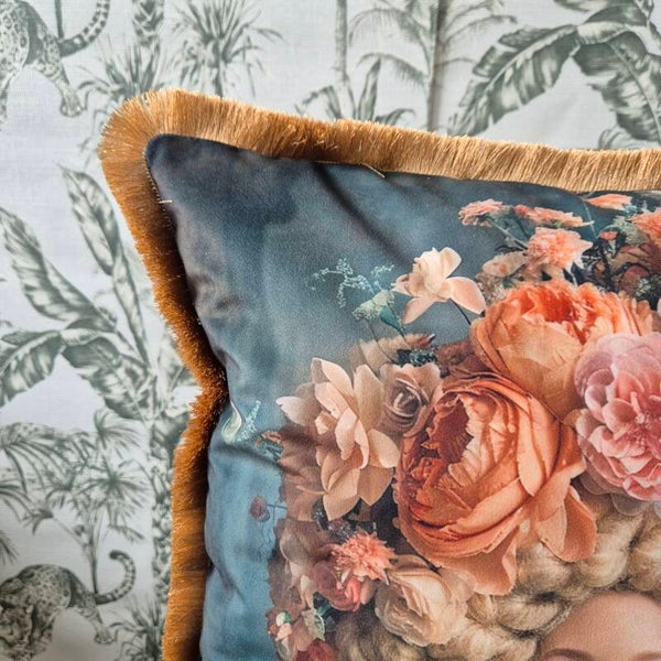 staalblauwe velvet kussenhoes vrouwenprint, velours sierkussenhoes 45x45cm met pastel kleurige bloemenprint, velvet kussenhoes met vrouwengezicht