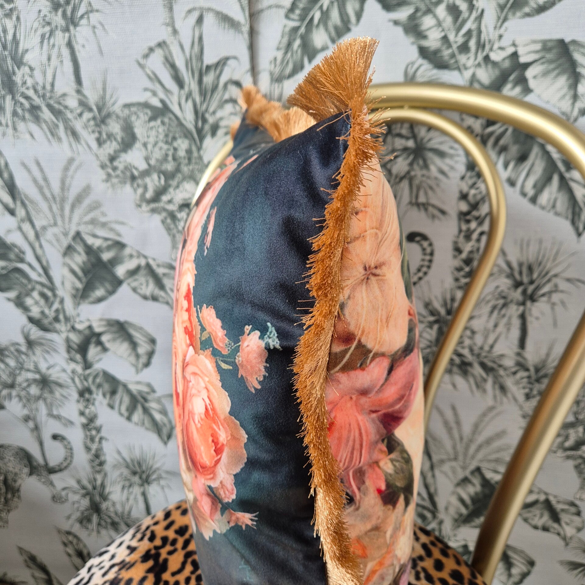 De achterkant is bekleed met een fluwelen stof met een bloemenprint in dezelfde schitterende kleuren als de voorkant.