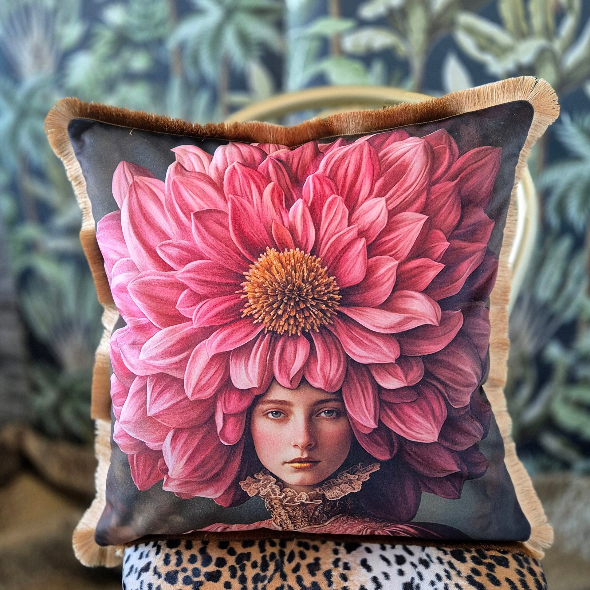 De voorkant van de kussenhoes, met een fluwelen bloemenprint, is een echte blikvanger. U treft er een gedetailleerde afbeelding van een vrouwengezicht aan, waarbij de vrouw een opvallende grote roze bloem als hoed draagt. De combinatie van de zachte fluwelen textuur met de levendige kleuren van de afbeelding geeft uw interieur een dromerige en artistieke touch. De vrouw in de afbeelding belichaamt empowerment en schoonheid, waardoor deze kussenhoes niet alleen decoratief is, maar ook inspirerend werkt.