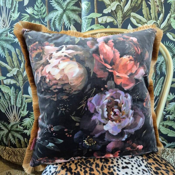 Wat deze kussenhoes extra speciaal maakt, is de zorgvuldige afwerking. De randen zijn verfraaid met een goudkleurige franje die niet alleen een gevoel van luxe geeft, maar ook een subtiele glans die het geheel laat opvallen. Het contrast tussen het zachte fluweel en de glanzende franje zorgt voor een visuele dynamiek die de aandacht trekt.