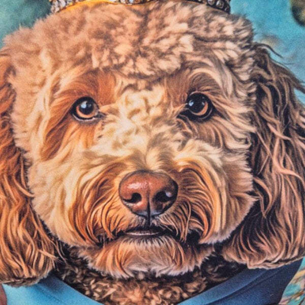 Voeg een vleugje luxe en speelsheid toe aan je interieur met deze handgemaakte velourse kussenhoes. De voorzijde is versierd met een prachtige print van een schattige labradoodle in een stijlvolle blauwe hoodie met op zijn kop een goudkleurige kroon, die zeker de aandacht zal trekken. De achterkant is gemaakt van een zachte goudkleurige velours stof die een weelderige uitstraling toevoegt aan elk interieur.