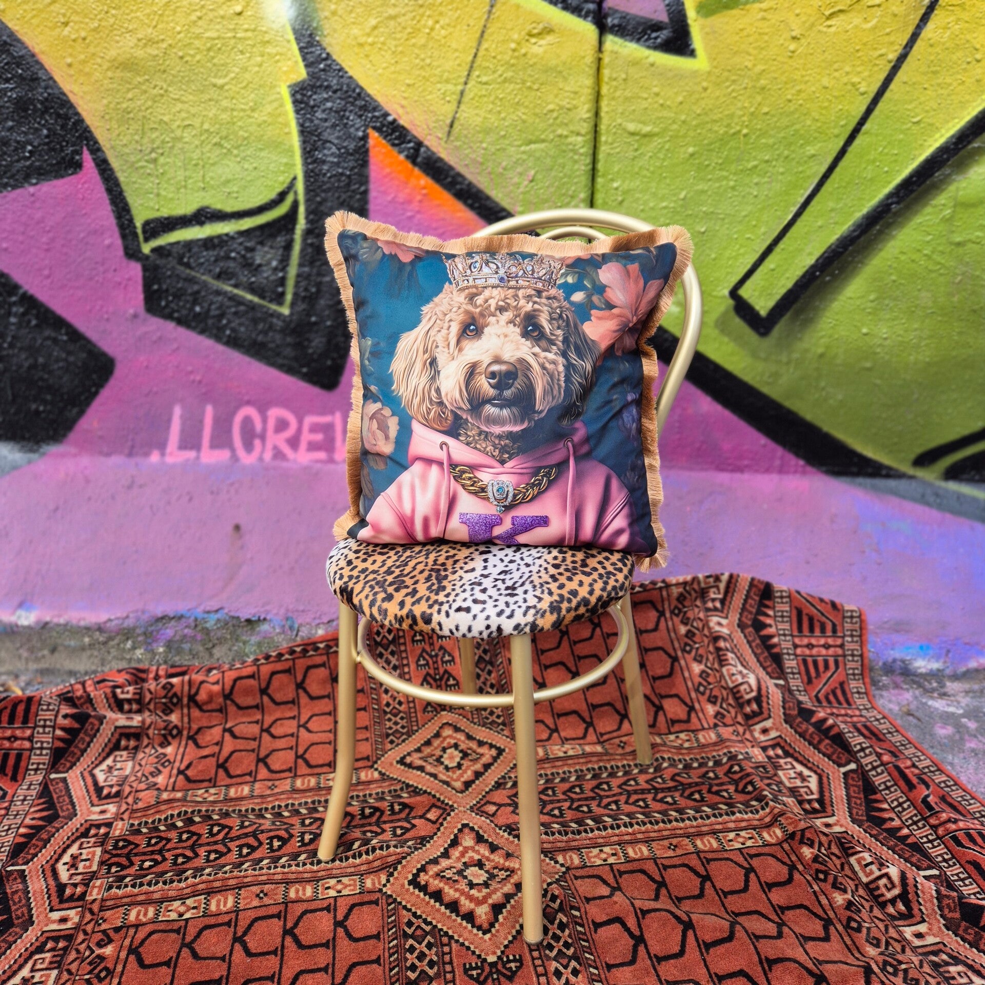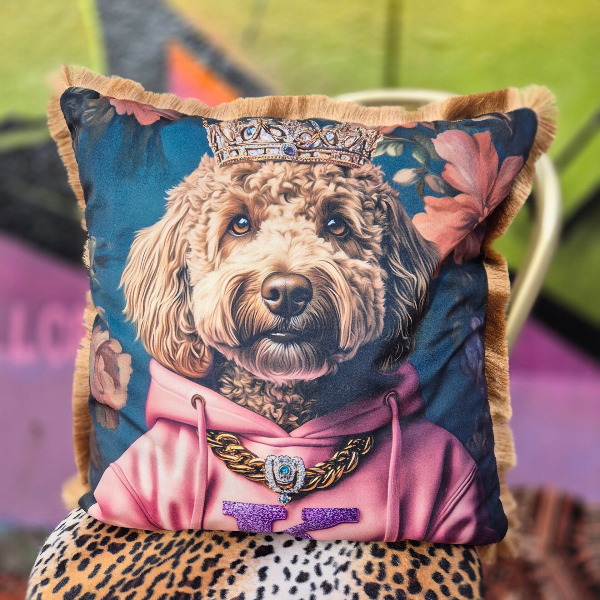 Voeg een vleugje luxe en speelsheid toe aan je interieur met deze handgemaakte velourse kussenhoes. De voorzijde is versierd met een prachtige print van een schattige labradoodle in een stijlvolle roze hoodie met op zijn kop een goudkleurige kroon, die zeker de aandacht zal trekken. De achterkant is gemaakt van een zachte petrol kleur velours stof die een weelderige uitstraling toevoegt aan elk interieur.