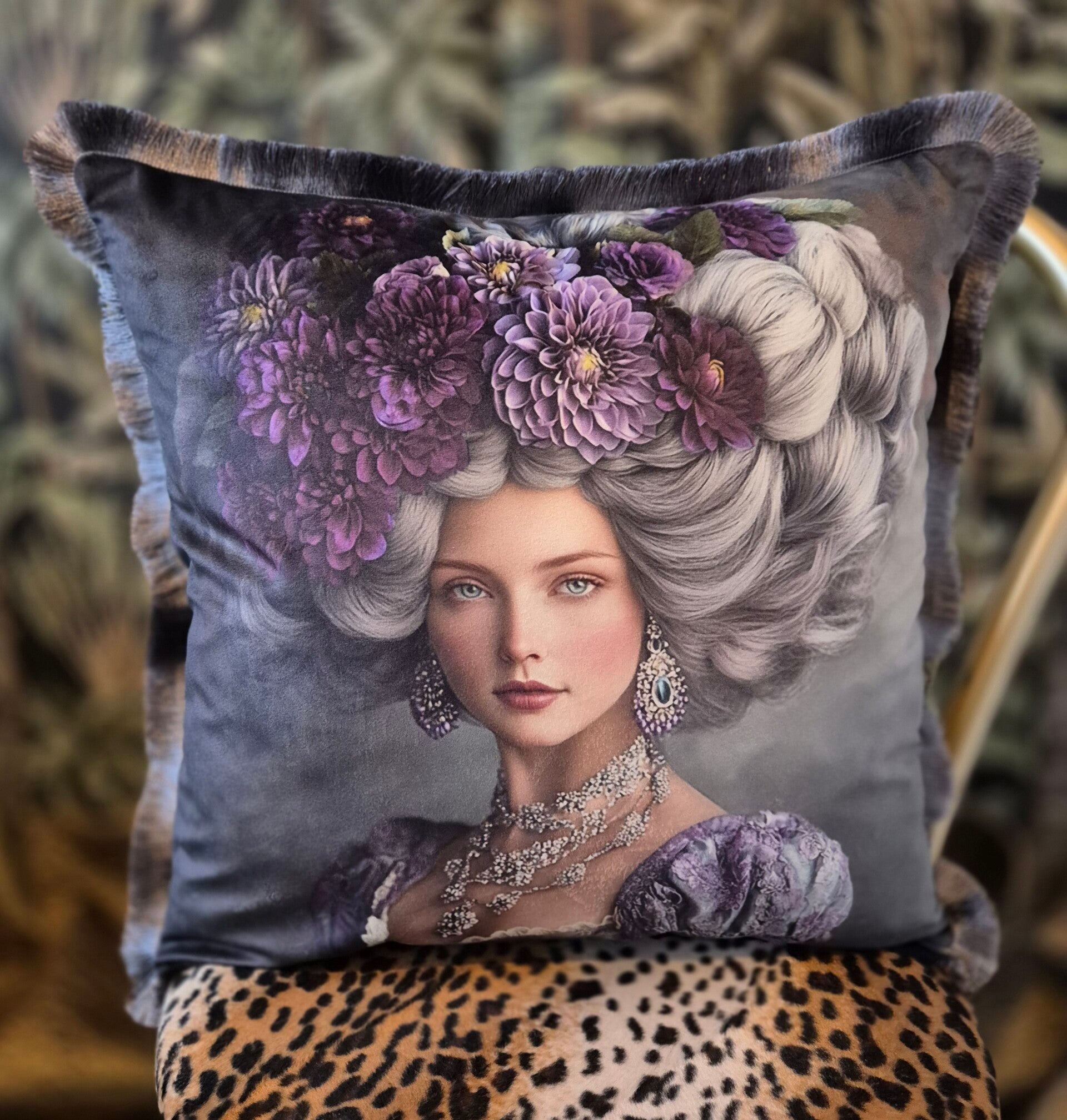 Geef je interieur een unieke touch met deze handgemaakte grijze velourse kussenhoes. De voorzijde is een sieraad op zich, met een prachtige print van een vrouw met grijze haren gevuld met paarse grote bloemen die een vleugje verfijning uitstralen. Het zilvergrijze franjeband aan de randen voegt een speelse, stijlvolle flair toe, waardoor deze kussenhoes perfect is voor elke woonkamer of slaapkamer.