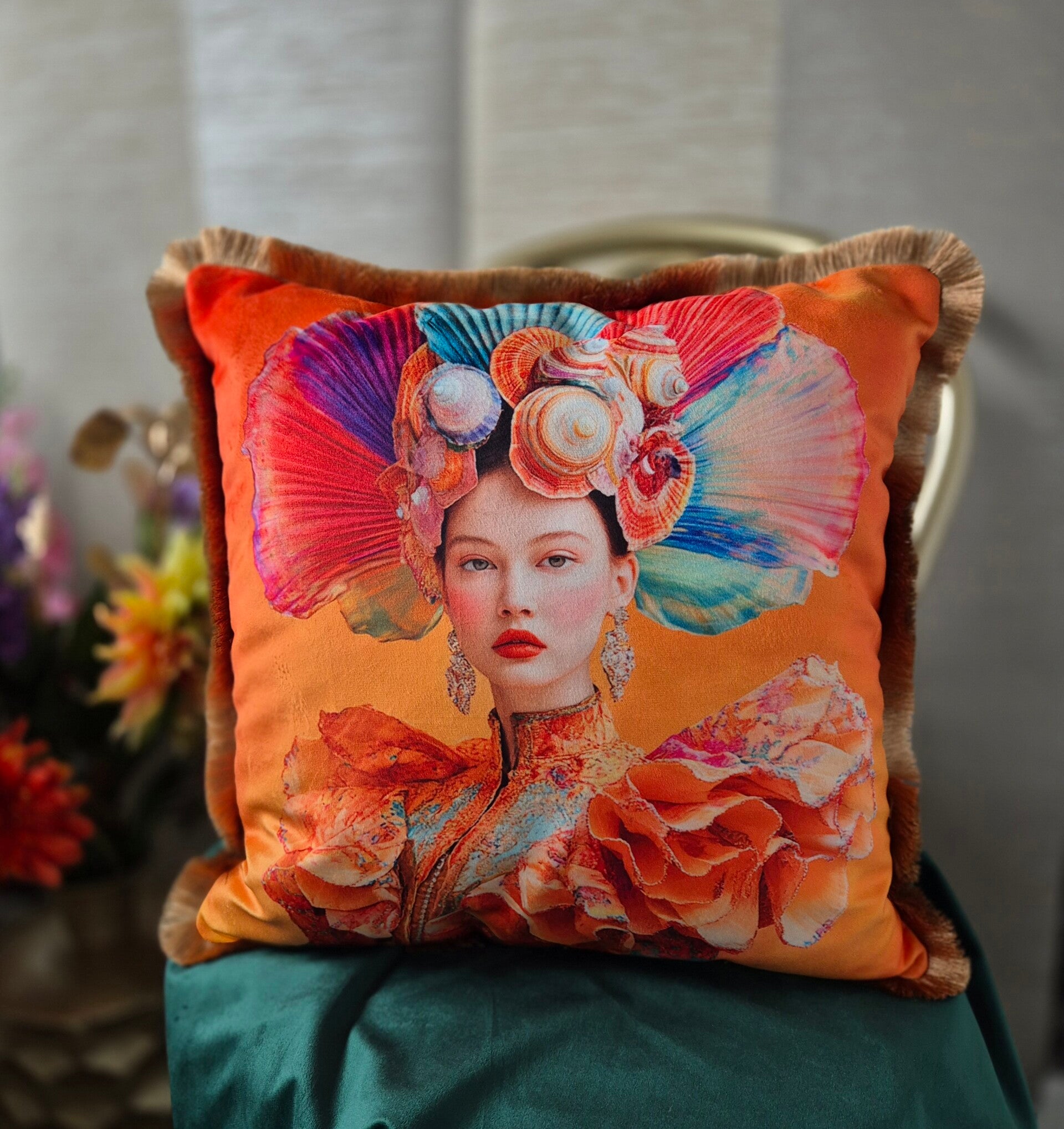 Velours kussenhoes met vrouw met schelpen, oranje sierkussenhoes, 45x45cm