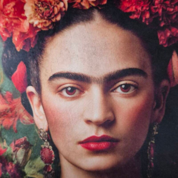 Breng een eerbetoon aan de iconische kunstenares Frida Kahlo met deze unieke, handgemaakte kussenhoes. De voorzijde is gemaakt van zacht velours en toont een levendig portret van Frida, omgeven door haar kenmerkende bloemen. Haar intense blik en de rijke kleuren van haar portret komen prachtig tot hun recht op deze luxueuze stof.
