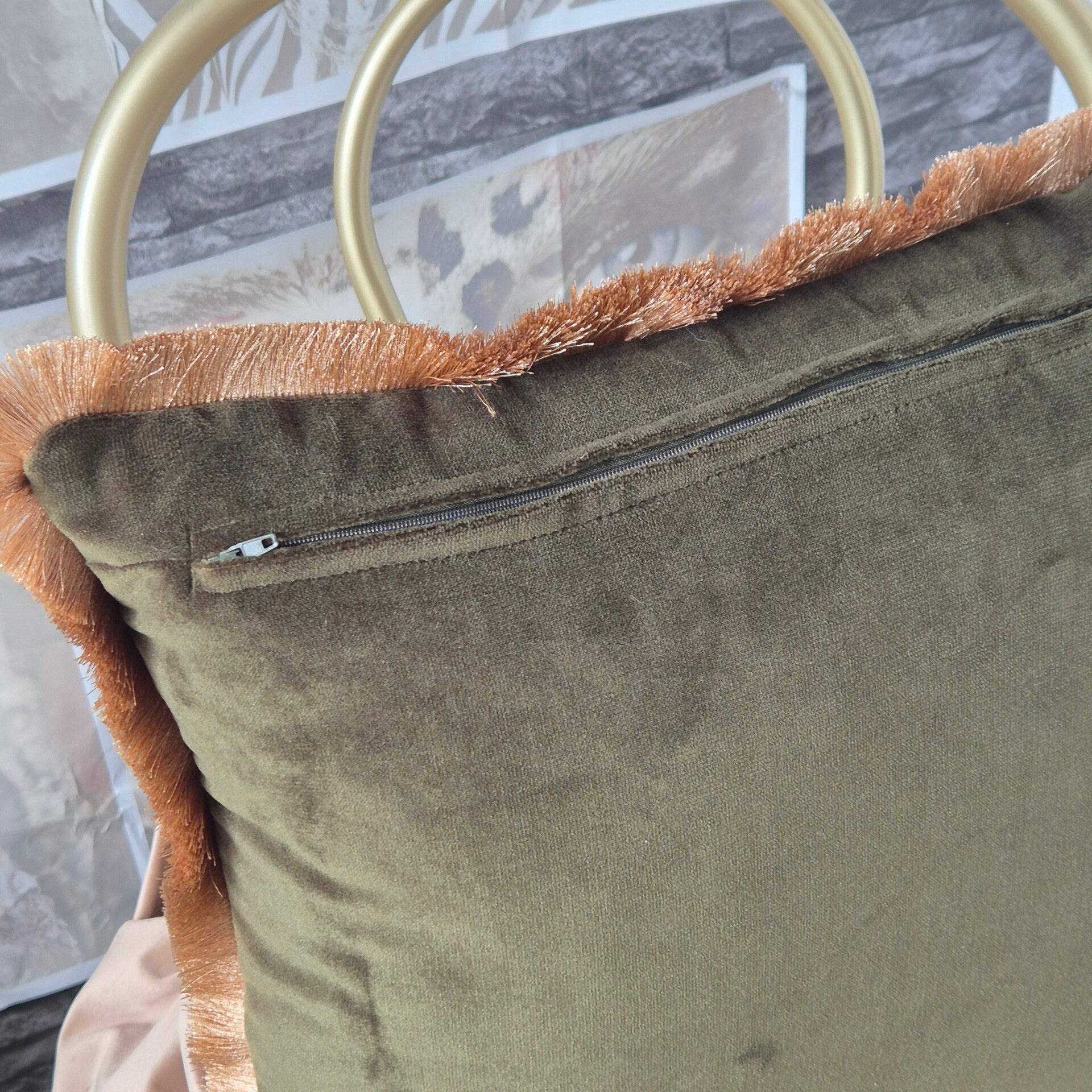 - Afwerking: Handgemaakt met een weggewerkte rits en een goudkleurige franje.