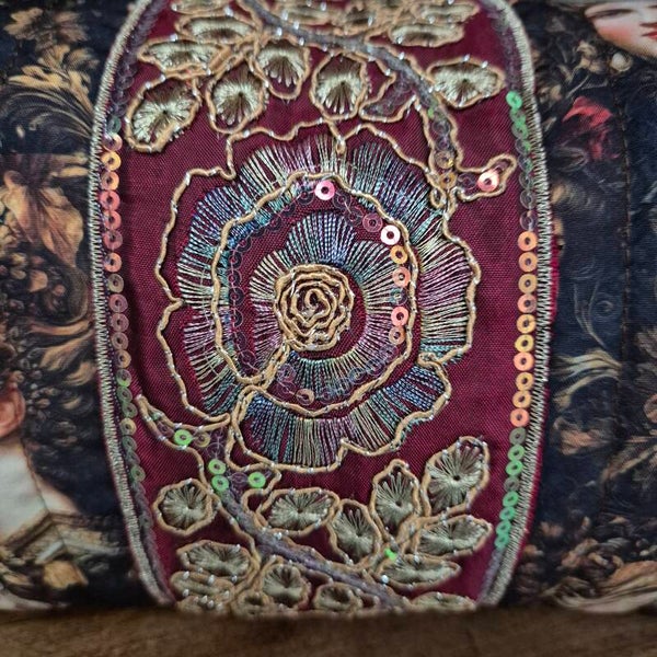 - Luxueus borduurwerk: Een prachtig breed donkerrood sierlint is zorgvuldig op de voorkant genaaid, wat zorgt voor een rijke textuur en een diep contrast dat de nostalgische sfeer accentueert.