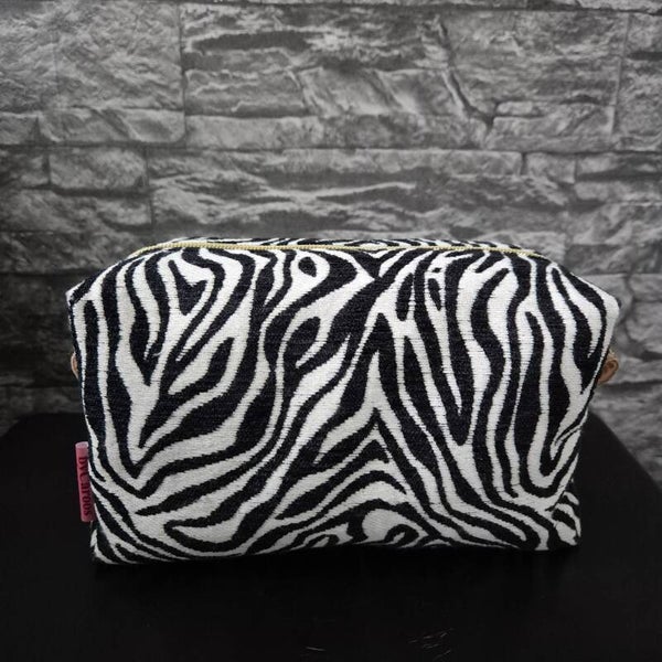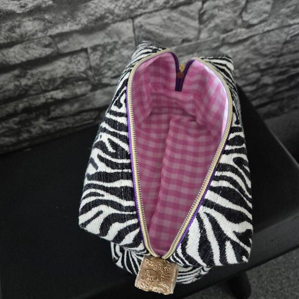 De buitenkant is gemaakt van een stevige stof met een opvallende zwart-witte zebraprint. De make-up box is versierd met speelse pop-art-achtige applicaties: