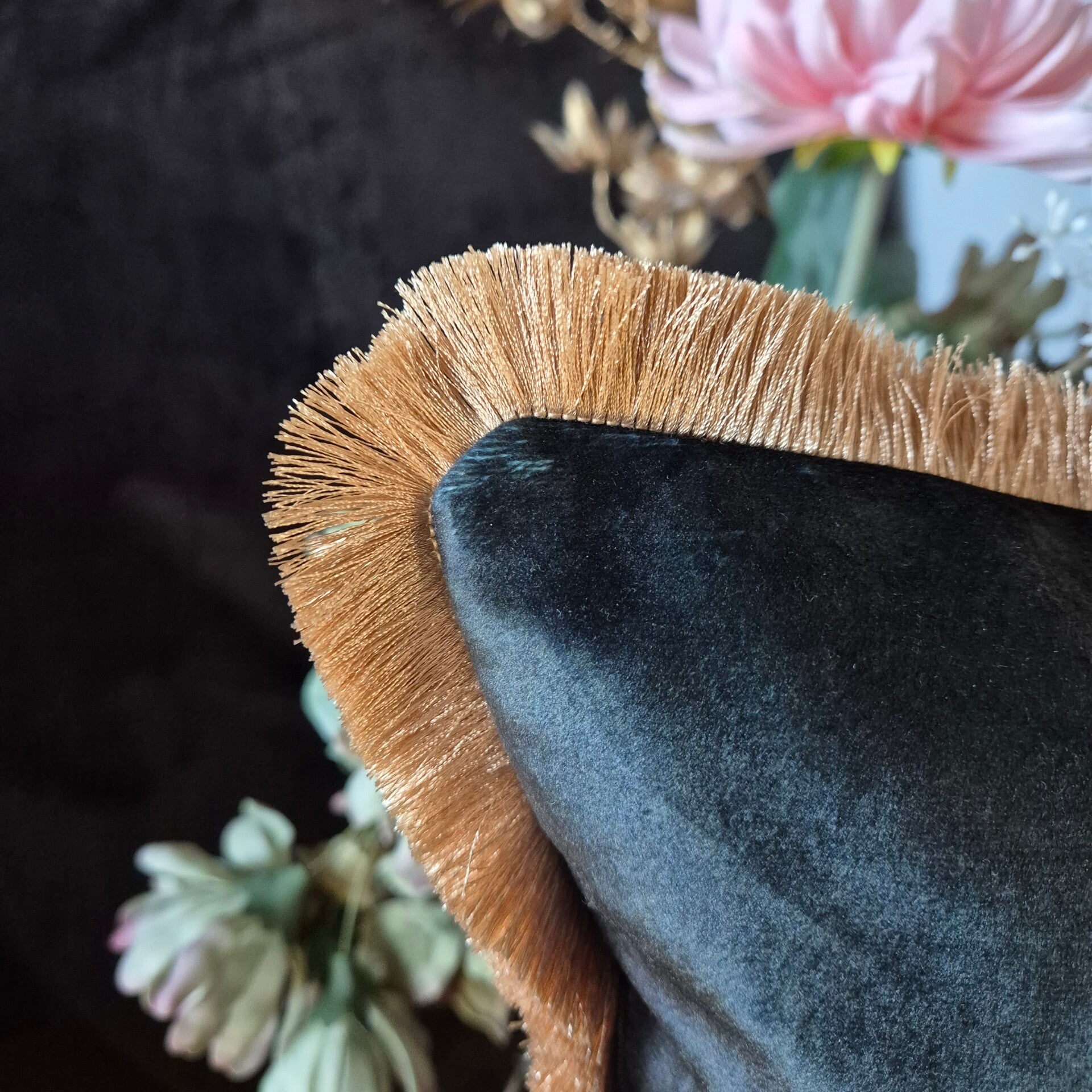 De voorzijde is gemaakt van een velourse stof voorzien van een indrukwekkende, hoogwaardige print die doet denken aan een klassiek olieverfschilderij. Het toont een tedere afbeelding van een vrouw met een bloemenkrans en een lichte sluier, die liefdevol een kind omhelst dat een kroon draagt. De rijke kleuren, de gedetailleerde weergaven van stoffen en sieraden, en de sfeervolle, donkere achtergond zorgen voor een luxe en kusntzinnige uitstraling. De kussenhoes is rondom afgewerkt met een sierlijke, goudkleurige franje voor een extra luxe touch.