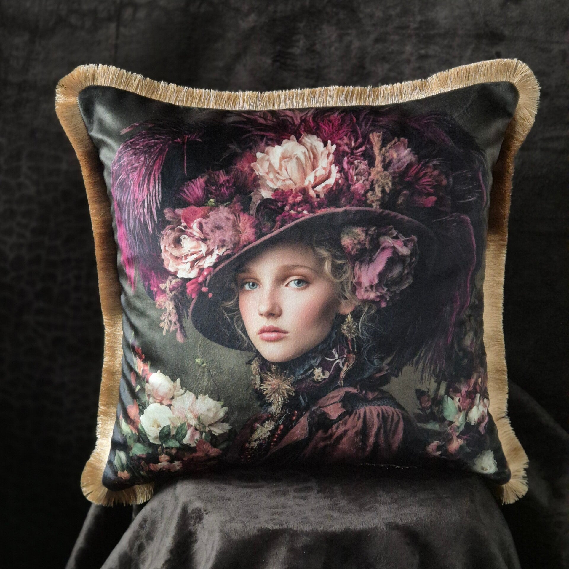 Luxe Handgemaakte Kussenhoes: Victoriaanse Florale Portret