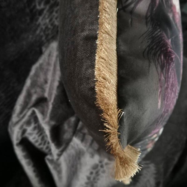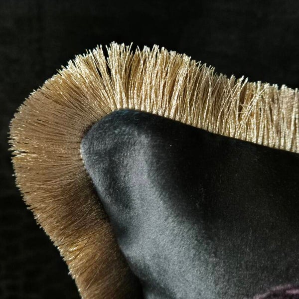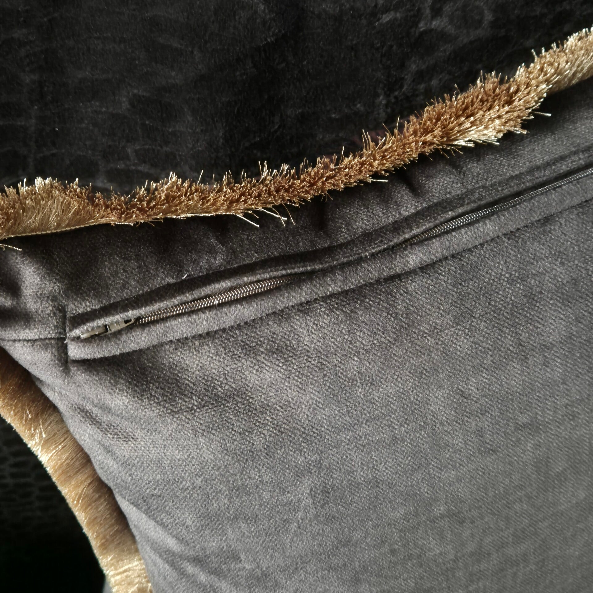 - Details: De randen van de kussenhoes zijn rondom luxueus afgewerkt met een fijne, goudkleurige franje, wat het geheel een extra glamoureuze en klassieke uitstraling geeft.