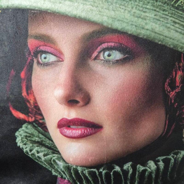 Voorkant: De voorzijde is voorzien van een verbluffend, door AI gegenereerd portret, gedrukt op een hoogwaardige velours stof. Dit kunstwerk toont een vrouw met intense blik, getooid met een weelderige hoed versierd met grote, oranje-rode bloemen. De rijke, donkere kleurrstelling en de dramatische make-up geven het geheel een barokke en mysterieuze uitstraling.