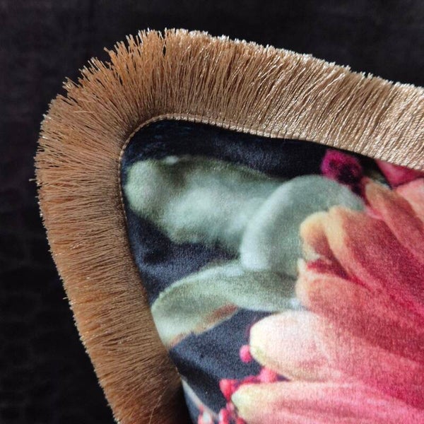Achterkant: De achterzijde is gemaakt van een diepzwarte, fluweelzachte velourse stof, die zorgt voor een luxueus gevoel en een mooi contrast met de print.