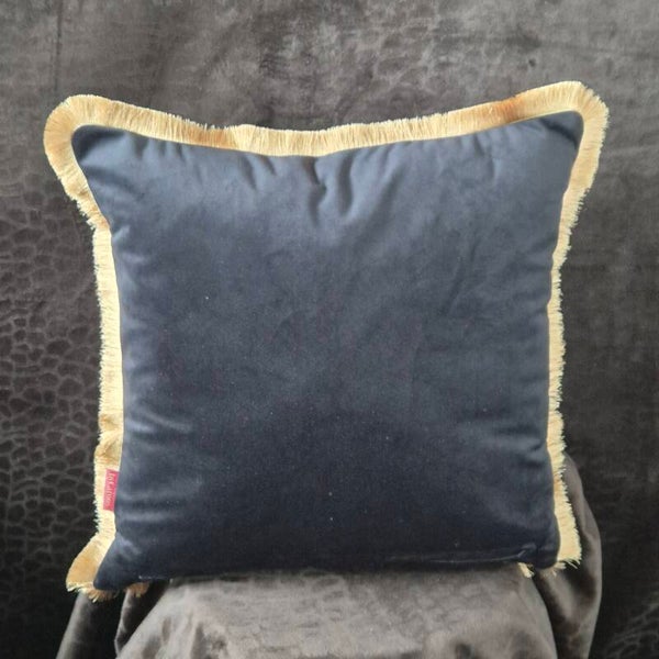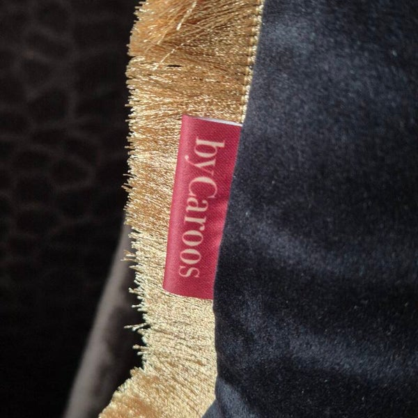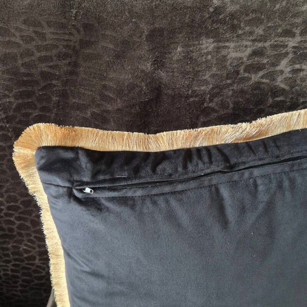 Afwerking: De kussenhoes is rondom afgewerkt met een weelderige goudkleurige bies die de randen stijlvol afdicht en de hoes een koninklijke uitstraling geeft.